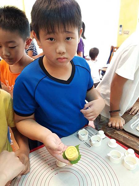 在爸媽的帶領下,孩子們完成了一個又一個的月餅,雖然只是利用大下課時間輪流進來教室和爸媽們一起工作,從他們的表情看得出來,每個孩子,都是滿足的。