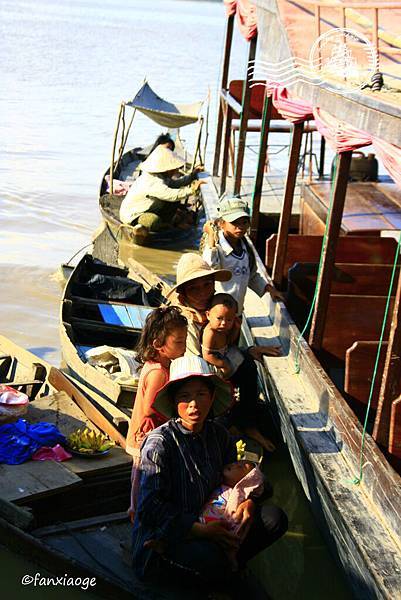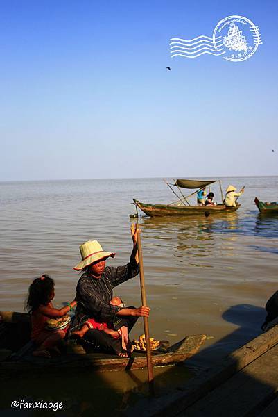 搭著小船行駛在洞裡薩湖上,許多水上人家迅速的駕著小艇靠近,才靠近就看見約莫五、六歲左右的小孩提著裝著飲料、水果的籃子敏捷的跳上船向遊客兜售,他們的表情是天真、可愛,卻又有一種無法言欲的世故,黝黑的皮膚、雙眼滑溜溜的轉著,緊緊抓住每一次可以賺錢的機會,從小就要與父母一起外出拼生活,這就是他們的童年了。