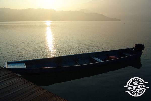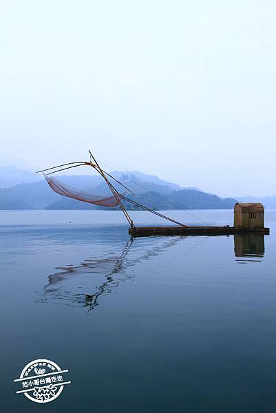 離岸邊約莫三十尺處,一艘竹筏靜靜的停留於湖片之上,該筏即是日月潭過往地方原住民謀生之四角吊網,竹筏、小屋、吊網,簡單,與湖中波瀾倒影呼應,極美。