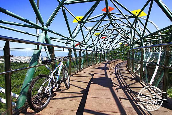 從眷村到鰲峰山(建議走鰲峰路),慢慢騎大概30分鐘,我們先騎到陽光草坪,這裡非常適合孩子奔跑;然後可以走上玉帶橋,然後就是往觀景台的入口,走上去有一小段路,不難走。如果不想走上去,也可以騎吳厝路到觀景台。觀景台視野遼闊,可以遠眺台中港、晚上夜景聽說是百萬美景,下次有機會再來拍!