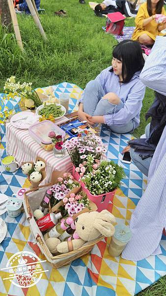 舞台前的草地上一塊野餐墊上,擺放的花色的花束、水果、麵包還有手工餅乾~爸爸推著嬰兒車、媽媽牽著小兒子帶著愉悅的笑容報到、進場~