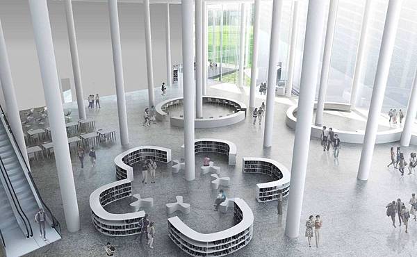 想像一下,當自己做在圖書館裡閱讀時,偶而,抬起頭來看見建築裡外的光影流動、視覺的延伸讓圖書館的空間與窗外的自然元素融合在一起;而大量運用玻璃、輕鋁材質的建築,營造出流動的感覺,彷彿,置身於綠美圖的自己,也成為了這座建築的一部分!