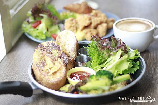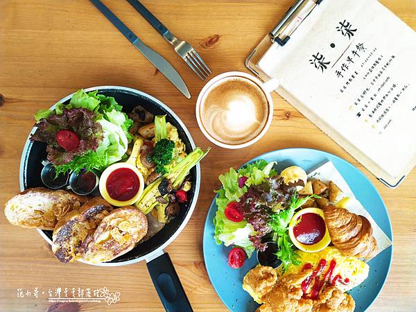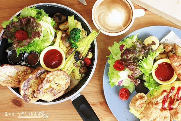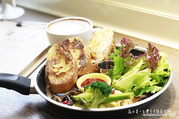 柒.柒法式軟法,光是視覺就讓人食指大動,平底鍋盛裝著烤麵包、搭配沙拉與烤蔬菜,以及松露滑蛋、香料野菇等,可以說料豐味美,醬料可以依照自己的喜好搭配。