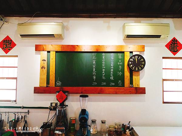 拉開木門進去,就是咖啡館的吧台,古色古香,後方牆上黑板寫著現有的單品手沖咖啡,吧台上也有甜點的菜單。
