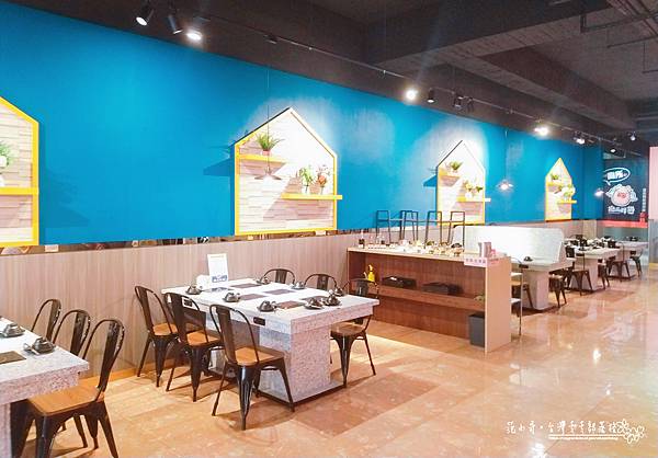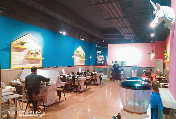 室內是普魯士藍搭配粉紅色系,我覺得挺搭的,有一種新潮時尚感!