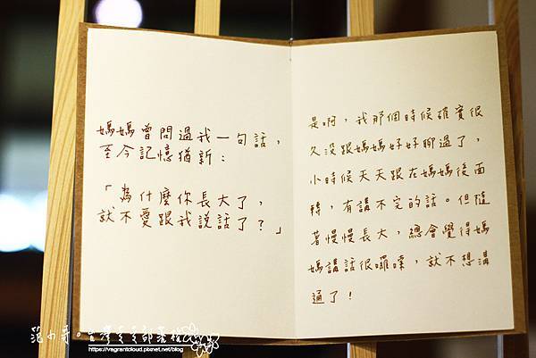 而佈展單位也相當用心,讓觀展者可以與顧老師的作品空間互動,一開始進入顧老師的文字氛圍中,再透過生活中的心情寫照,引領出觀展者的記憶與情感流動,甚至可以寫下自己當下的心情,對自己或家人訴說最真實的情感,這都是一種特別的情感連結與釋放,進而讓自己也可以得到和解。