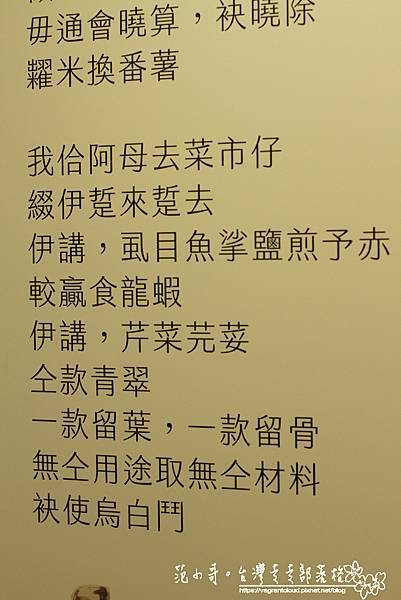 顧老師說「虱目魚挲鹽煎予赤,較贏食龍蝦」;她問阿母,「風颱天,菜遮貴欲按怎過日子?伊講,好天愛積雨天糧」;她更說了「阿母叫我,未嫁翁,著愛學款厝內,作新婦,著愛會曉算飯菜」強烈的記憶與情感,帶著趣味與智慧,讓人再熟悉不過,這不正是每一個人生活中的味蕾記憶嗎?
