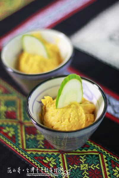 南瓜蒸熟後搗成泥狀,是一道很爽口的甜點!