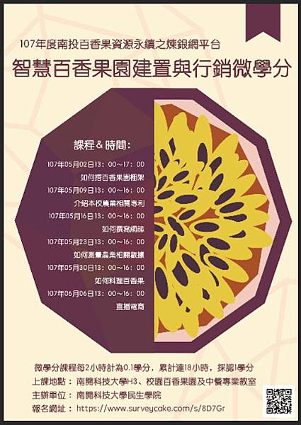 值得一提的是,南開科技大學首創百香果微學分,希望透過深入產業,把百香果園轉變成上課的教室,培養學生的動手做的能力,透過計劃實踐,讓學生能常駐社區,培養務農的知識,也能讓學生運用在校所學到的專業知識以及技能來幫助農業發展,而學校亦可以安排學生在假期中來社區打工駐點,漸進而開發願意務農的年青人,為未來農村發展與地方創生注入一股活力!