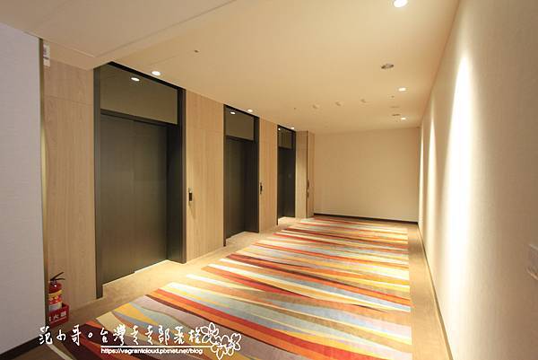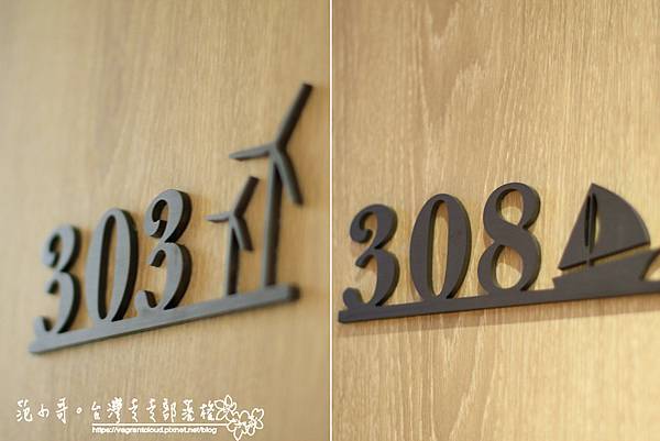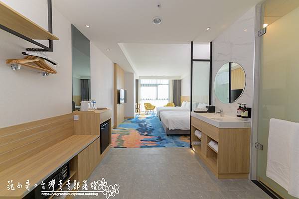 酒店共有118間全景窗時尚設計客房,每一間空間設計都別出心裁且融入在地特色;例如每層樓的地毯就是採用高美濕地夕陽的意象,呈現出波光粼粼的特色,另外,房門上的房號則是搭配海線的船與風車意象,呈現出在地的連結性,連房卡都很有在地特色。