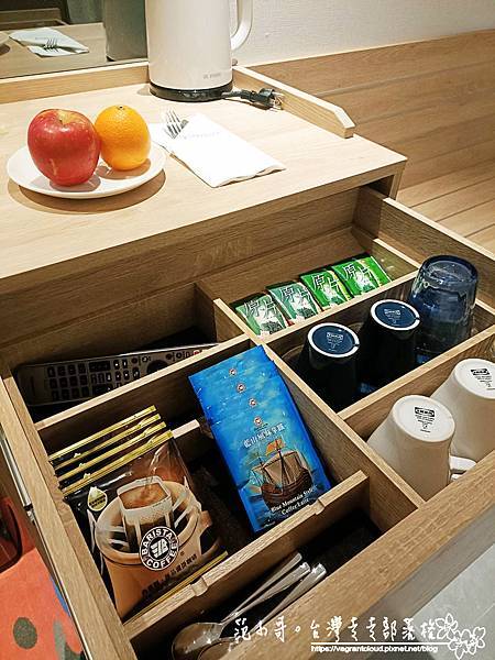 房間內還附有咖啡、茶包、水果與杯具供住客使用。