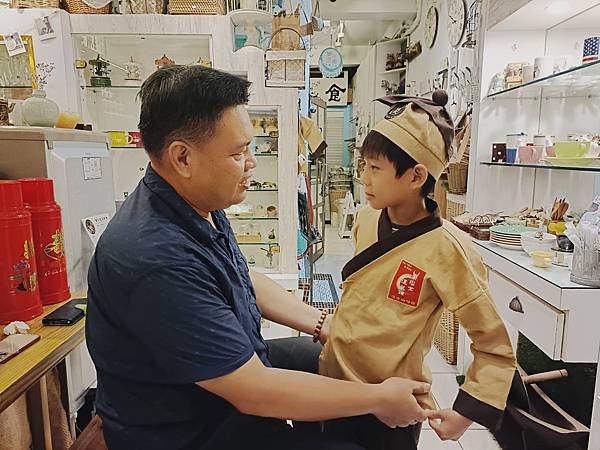 (陳老師為孩子換上小藥童服裝,有種傳承的意味!)