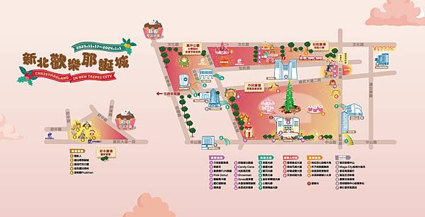 第13年的「2023新北歡樂耶誕城」,已經從11/17(五)起,連續46天點亮新北。今年由桑塔熊與他的好友們蘿比兔、薑餅人、雪諾曼、巧克鼠及馬卡龍邀請大家一起參加耶誕城甜蜜派對。分別在市民廣場、站前廣場、萬坪公園及府中廣場等,營造夢幻主題燈海!更特別打造天幕式耶誕樹化身為抹茶耶誕樹蛋糕,周圍設置繽紛甜點蛋糕以及層層光影設計,宛如蛋糕糖霜般點綴整個耶誕樹,浪漫氛圍佈滿整個新北市!