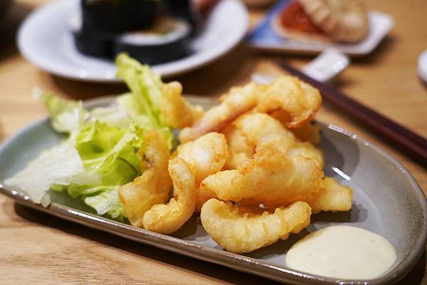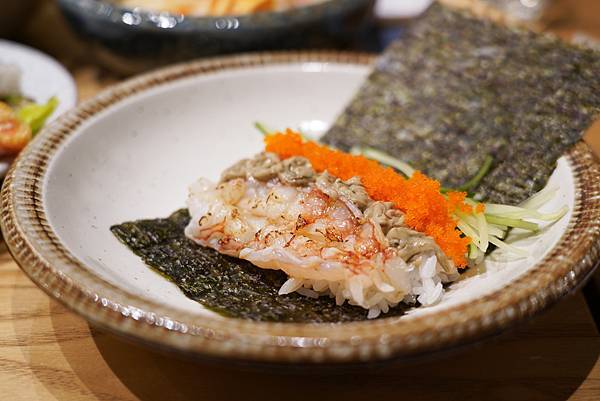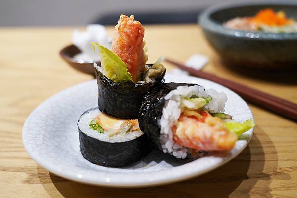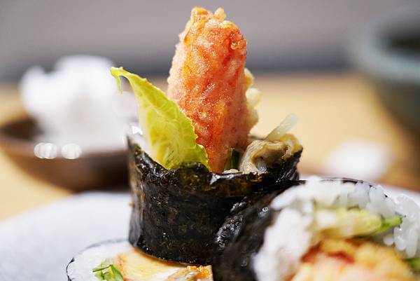 這道就是將蟹腳炸過之後,用壽司的方式搭配生菜等食材捲起來,看起來也很美觀,內酥外Q,也蠻好吃的!