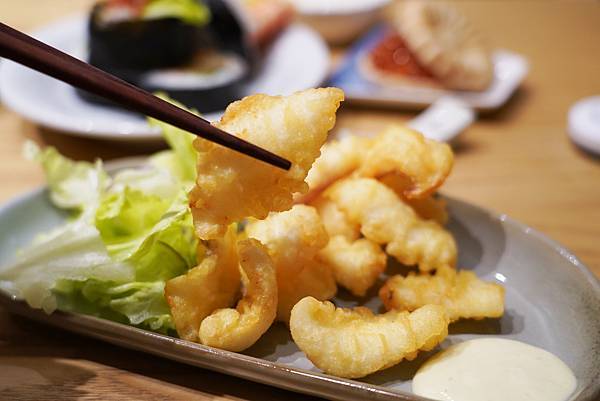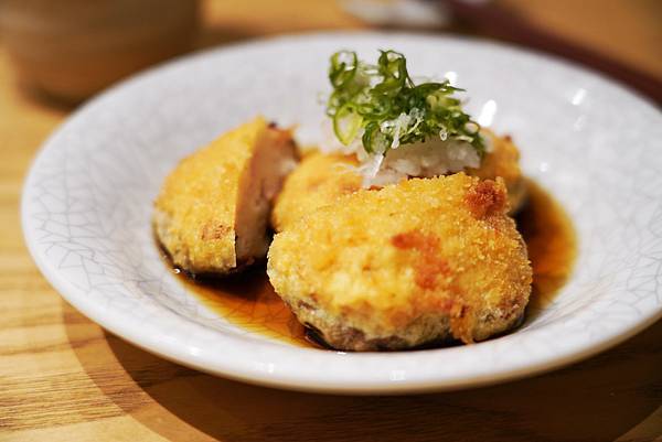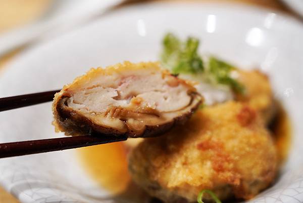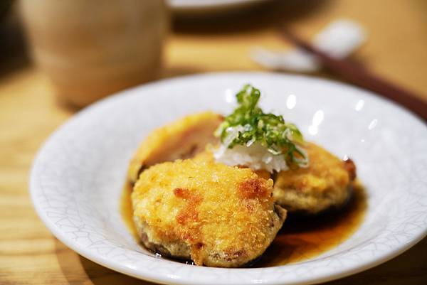 這道師傅手工特製的料理也蠻好吃的,使用花枝、香菇等食材,裹上麵包粉後經油炸,再淋上日式醬汁,香氣四溢令人不禁流口水!花枝增添入口的口感與嚼勁、香菇則是襯托出香氣,沾上醬汁更加入味。