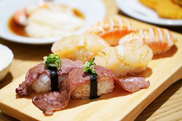 壽司盛有有多種組合,一次可以吃到三種不同口味,而壽司6貫B有鮭魚、干貝和牛肉。鮭魚軟嫩口感極佳、牛肉炙燒得恰到好處,非常鮮甜,搭配醋飯呈現出多層次風味,至於干貝當然也沒話說,Q中帶脆很讚喔!
