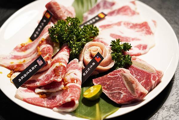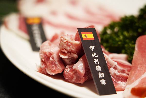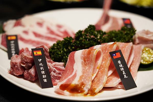 全豬套餐有伊比利豬梅花、伊比利豬肋條、醬燒豬五花、小戰斧豬排、特選松阪豬等等,光是食材的色澤與油亮程度就知道非常新鮮,伊比利豬被稱為「是世界上最好吃的豬肉」,不僅油花分布均勻,還有淡淡果香,烤過那份口感與香氣,嘖嘖~真是好吃啊!!