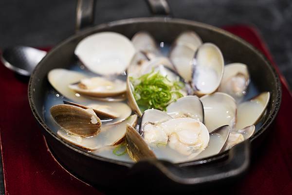 海鮮部分也很豐富,包括生食級北海道干貝、大草蝦、 蒜香蛤蜊鍋。北海道干貝超大顆,搭配昆布鹽、鮭魚卵呈現出鮮甜、豐富的口感層次;大草蝦很大隻,肉質非常有咬勁且鮮甜;蒜香蛤蜊鍋使用新鮮大顆且飽滿的蛤蜊,湯頭鮮甜!