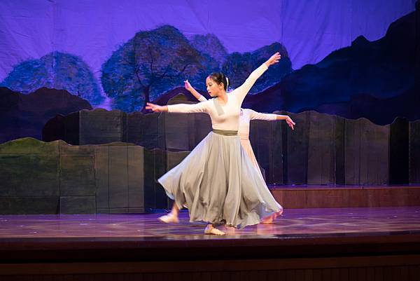 這一幕由丙申兩位同學連袂演出,伴隨著樂聲只見輕柔的蝴蝶翩翩起舞,「逶迤拖地月華千水裙,裙角綉著展翅欲飛吟。」隨著笛聲與琴聲起舞的彩蝶,彷彿是,跌落人間的仙彩神韻。說實在耊一幕就讓人起了一身的雞皮疙瘩!繼鴻門宴之後,又讓人眼睛為之一亮!