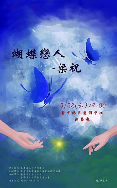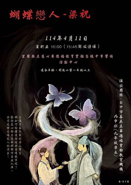 中國四大民間傳說之一的《梁祝》,不僅傳頌一千八百多年,更被改編成許多膾炙人口的電影、戲劇及音樂劇,無論時代如何變遷、歷史如何更迭,《梁祝》所帶給人民的隱喻,這個傳說應該會不斷地延續下去;而在2025年3月22日,在台中市清水區港區藝術中心,由善美真華德福九、十年級孩子帶來的年度戲劇公演《蝴蝶戀人梁祝》,在這千年之後,用一齣驚豔全場的戲劇與之共舞......。