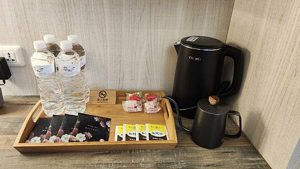 此外,迎賓小物會按照照房型對應人數,提供瓶裝水、咖啡包、烏龍茶包與茶具等等;盥洗設備也很齊全、乾淨,整體來說,房間設計與設施都很貼心與細緻,給人很好的住宿體驗。