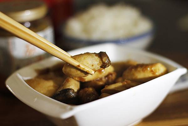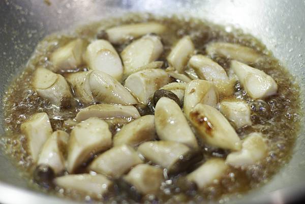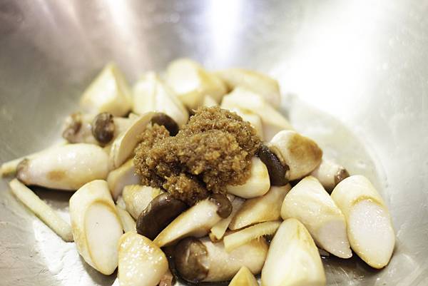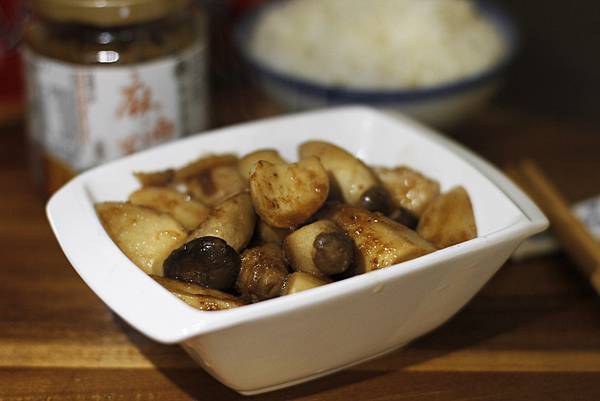 做法:杏鮑菇切塊先乾扁逼出水分,加上薑絲稍微爆香,最後加上麻油薑泥、水與油膏些許,悶煮一下即可。