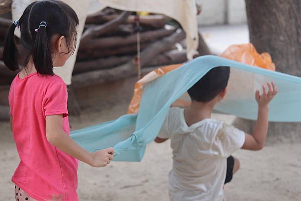 在教室的每個角落的木頭、樹枝等自然素材,以及老師與家長們手作的布偶、染布等,都是孩子自由遊戲的玩具,讓孩子可以自在地建構場景、角色扮演,創造力與想像力,就在日常生活中滋長著,對孩子來說,教室就像是一個寶庫,充滿探索的樂趣,這樣,孩子還會不想上學嗎?