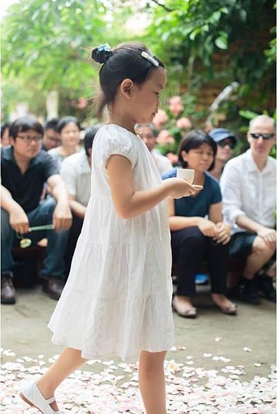 穿上白鞋,孩子小心翼翼的捧著一杯茶,走過象徵靈性世界的彩虹橋,帶著天賦履行自己的任務;走過彩虹橋,在爸媽面前跪下、然後感恩、敬虔的為爸爸或媽媽奉上一杯茶,爸媽也為孩子戴上帶著祝福的禮物,擁抱孩子、給予最深刻的愛。